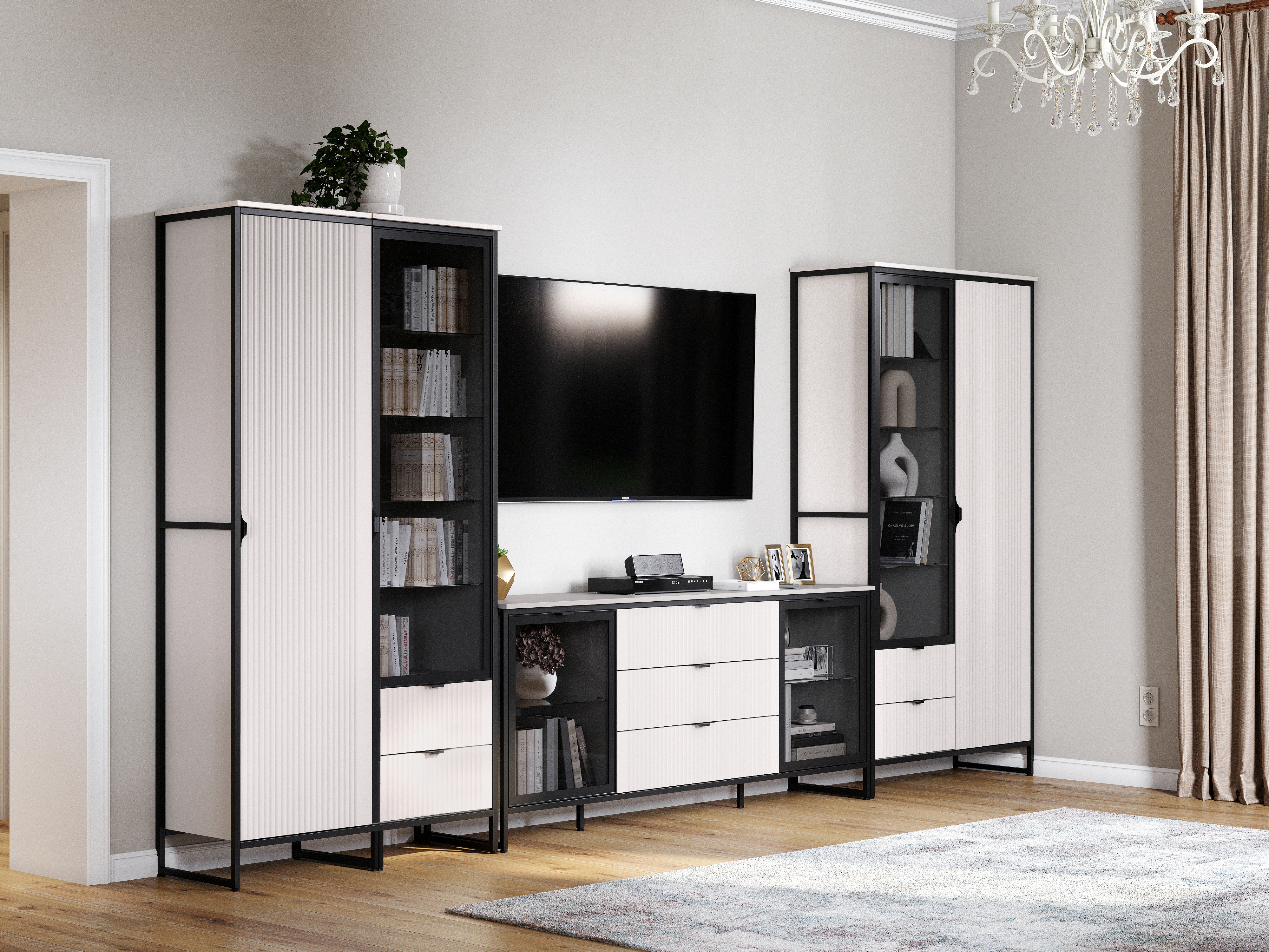 Коллекцию модульной гостиной "Нора" отличает современный оригинальный стиль. Декоративная продольная фрезеровка на фазадах из МДФ и опоры на металлокаркасе соответствуют модным тенденциям этого года в ведущих зарубежных коллекциях.