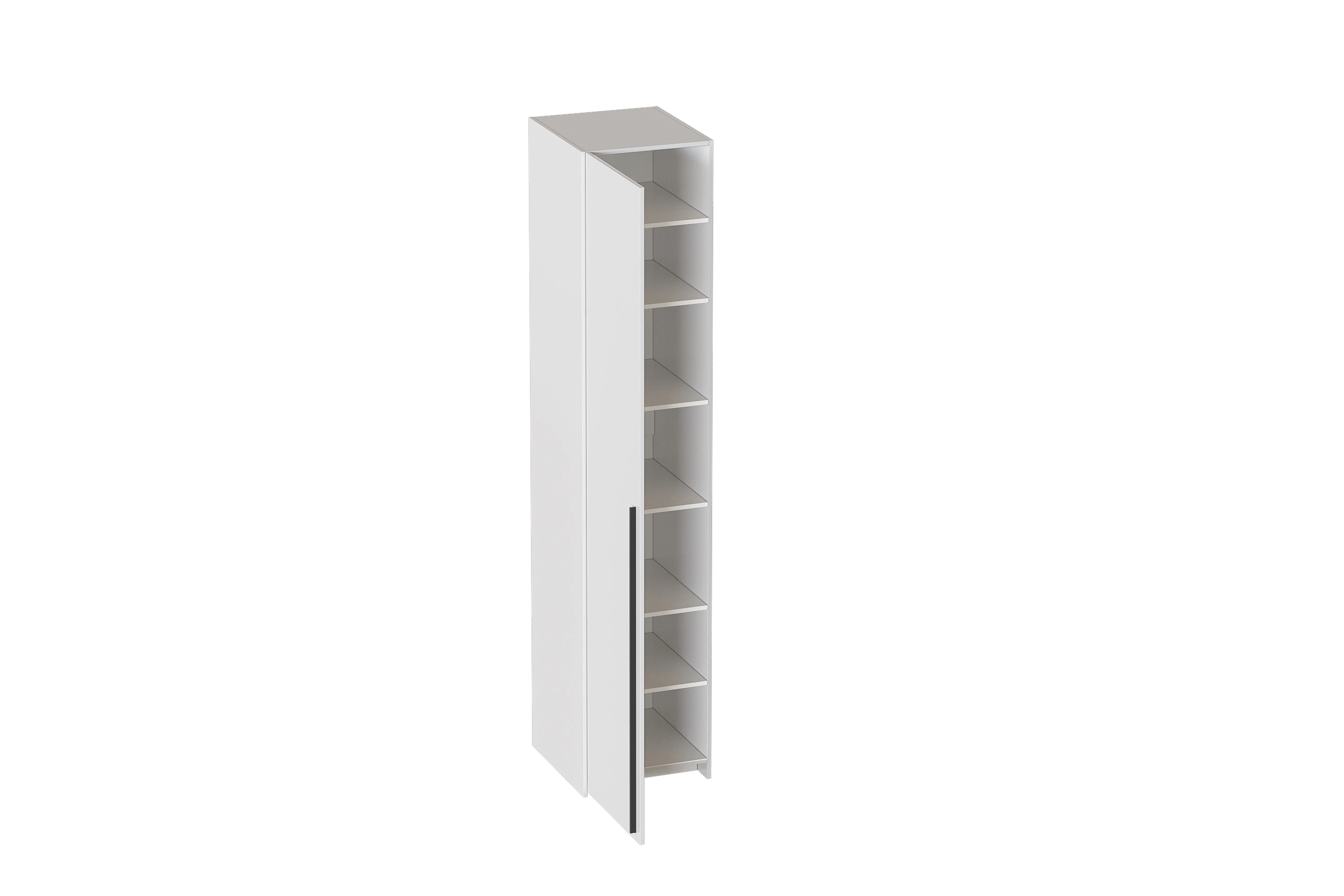 Конструкция шкафа состоит из двух боковых стенок, между которыми расположены стационарная полка, пять съемных полок и цокольная коробка. Шкаф оснащен накладными петлями с амортизатором.