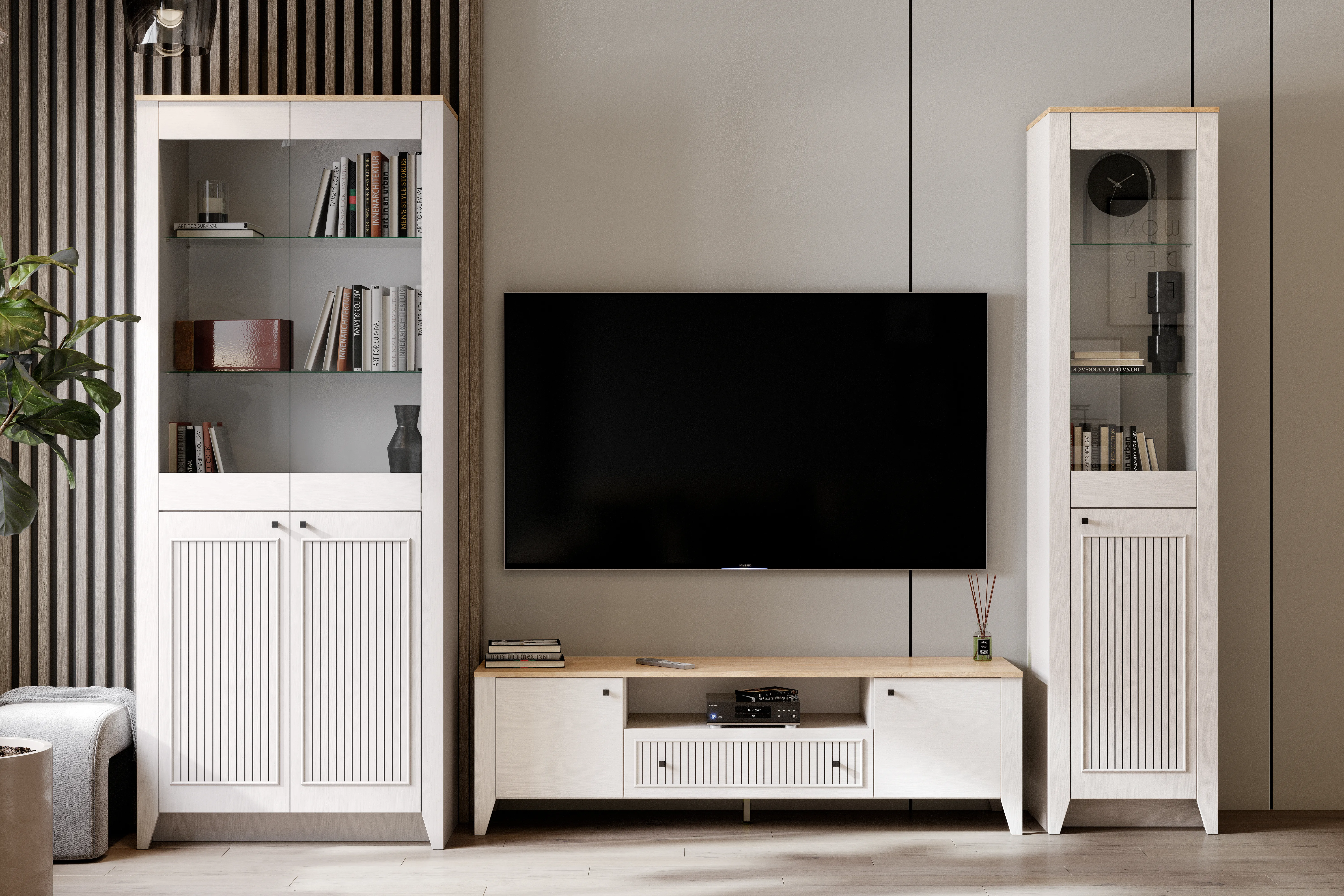 УФ-фотопечать полосок на фасадах в обрамлении пластиковых молдингов придает изделию оригинальный стиль современной классики.