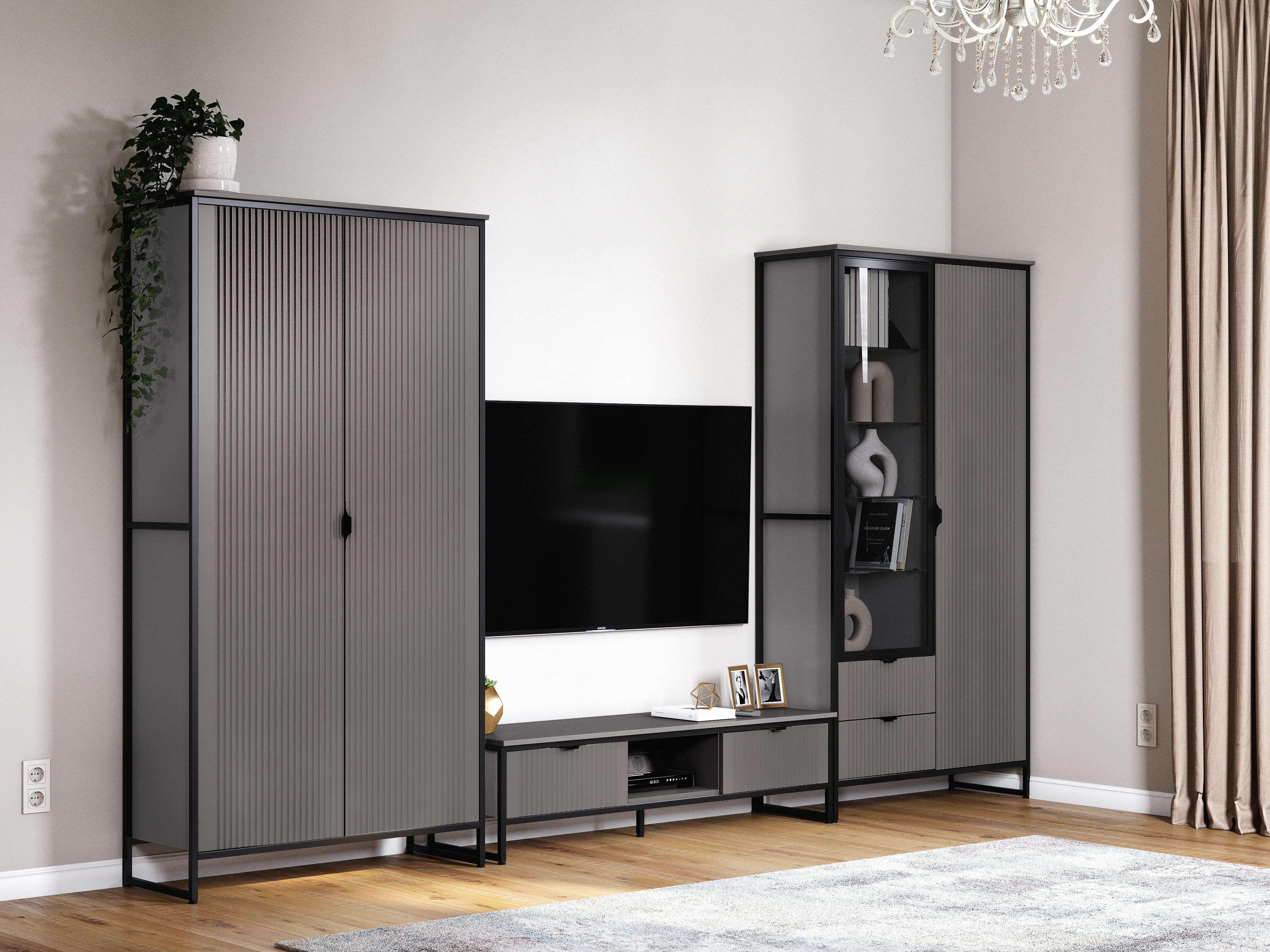 Коллекцию модульной гостиной "Нора" отличает современный оригинальный стиль. Декоративная продольная фрезеровка на фазадах из МДФ и опоры на металлокаркасе цвета соответствуют модным тенденциям этого года в ведущих зарубежных коллекциях.