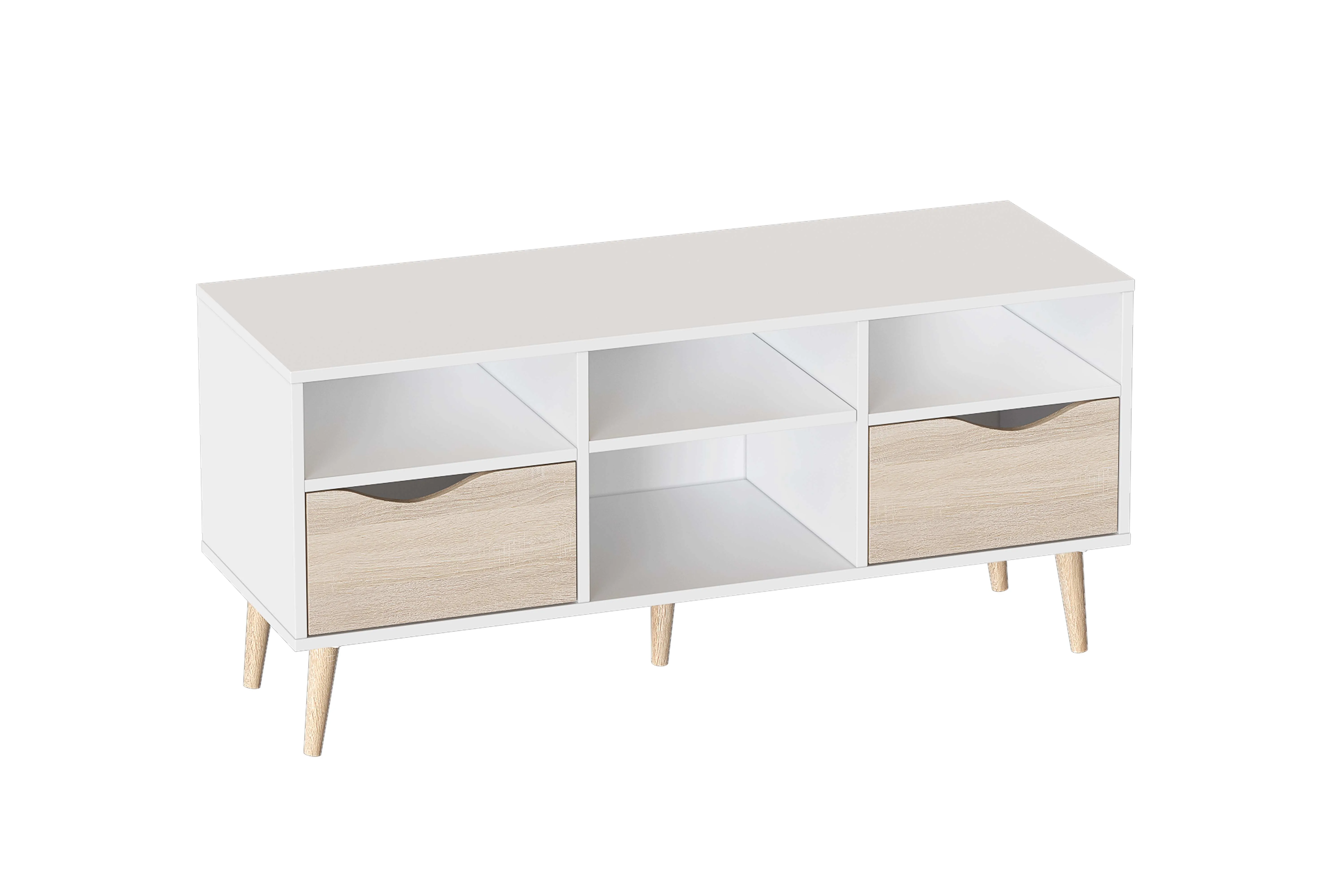 Тумба под ТВ "Соната" сформирует композиционный центр ТВ-зоны и позволит сохранить больше свободного пространства в гостиной. На поверхности модуля можно расположить телевизор с диагональю до 55-60 дюймов. Упорядочить хранение сопутствующих аксессуаров и компонентов домашнего кинотеатра помогут выдвижные ящики с фасадами, декорированными вырезными ручками в цвете «Дуб Сонома», и открытые ниши.